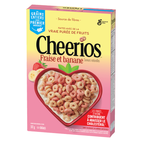 Grâce au goût irrésistible de la fraise et de la banane combiné aux bienfaits nutritifs des céréales Cheerios que vous connaissez et aimez, ces céréales sont une délicieuse gâterie pour toute la famille ! Le mélange parfait de fraises et de bananes a le même goût que vos boissons fouettées du matin. De plus, les céréales sont faites avec de la vraie purée de fruits ! Essayez toutes les céréales Cheerios, car les grains entiers en constituent toujours le premier ingrédient ; parfait pour bien commencer la journée ! Un déjeuner ou une collation savoureux et nutritif, et qui se prête bien à une recette.
